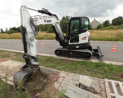 The Bobcat E62 is a zero tail swing design compact excavator with an operating weight around 6.2 tonne.
